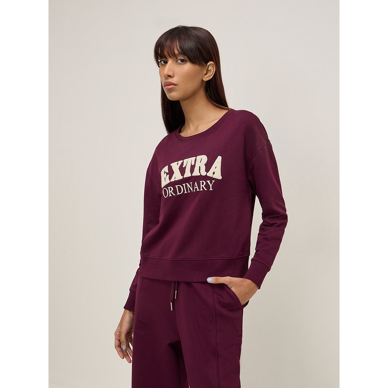 Studiofit presents this wine Sweatshirt flaunting text embroidery. Offering a regular fit frame, the pure cotton garment boasts a ribbed round neck and full sleeves.