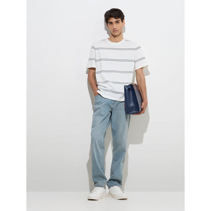 This white t-shirt from WES Casuals brings a clean yet casual appeal with its stripe detailing. Made from pure cotton, its tailored in a relaxed handle with half sleeves and a classic crew neckline.