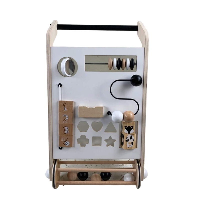 “This adorable wooden walker will help your child with their walking skills. The front serves as an entertaining activity center full of endless fun!”
