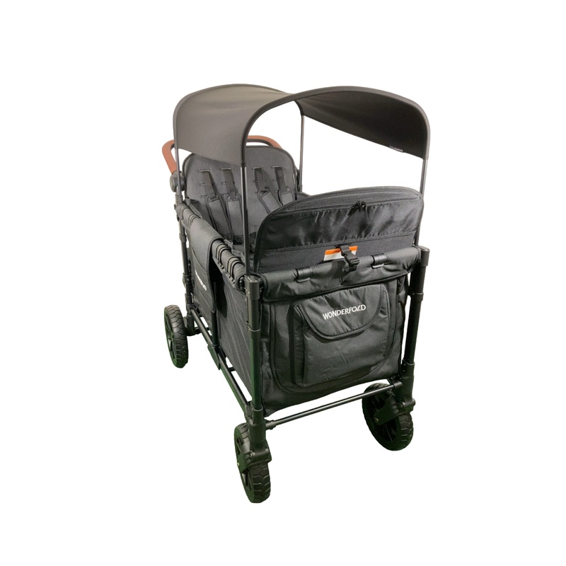 This wagon is amazing! It can hold up to 4 kids and includes magnetic harness seats a large canopy and tons of storage. If you want to use without seats, the seats are removable. There is a sturdy mattress style bottoms for naps. Canopy provides UV protect