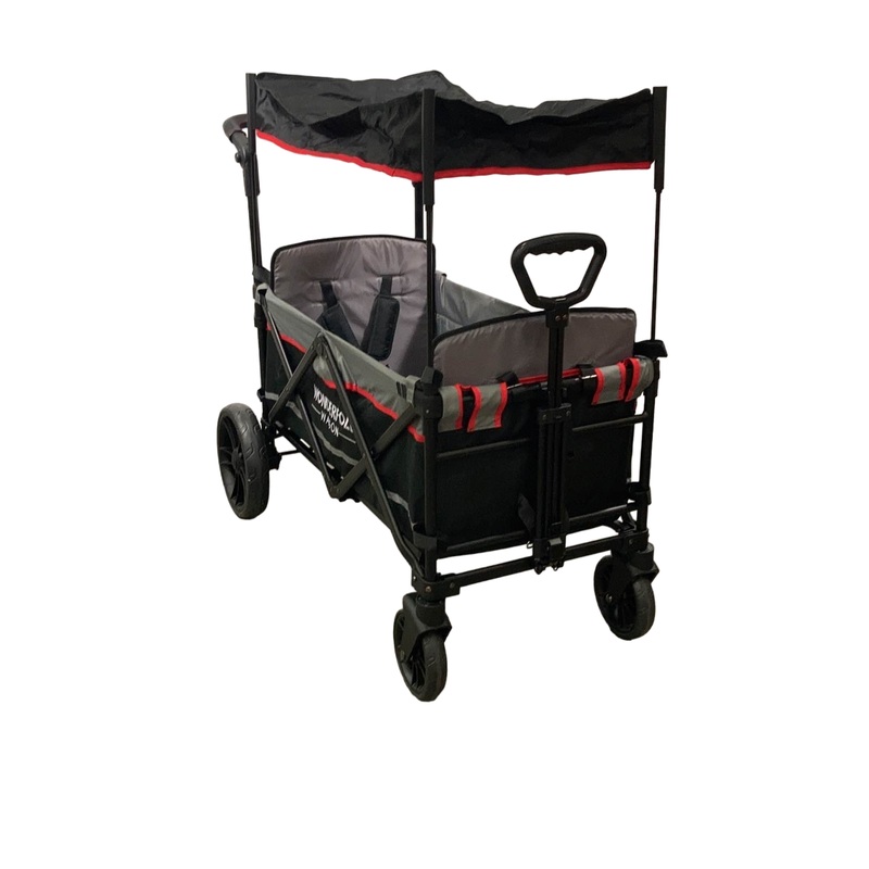 “This wagon is amazing! You can push it like a stroller or pull it like a wagon! It can hold up to 2 kids and includes harnessed seats with a large canopy that provides UV protection.”