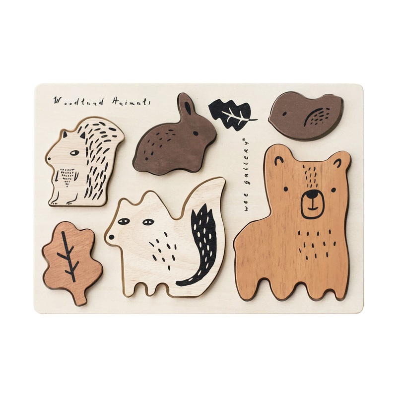 Description This beautiful six piece Wooden Puzzle is perfect for so many kinds of play! Solving the sturdy tray puzzle is just the beginning. You can also use the adorable wooden animals as play time characters in this themed Woodland set. For more educat