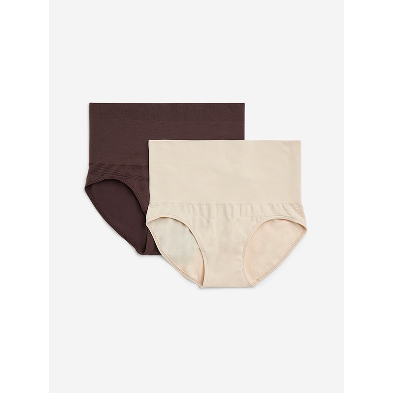 Wunderloves dark brown and beige shapewear briefs set are crafted from ultra-lightweight fabric for a smooth, second-skin feel. Designed to sculpt your waistline without compromising on comfort, they feature a secure elasticated waistband for a supportive,