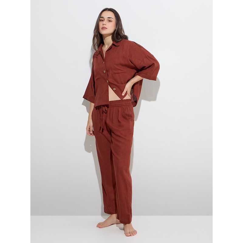 This dark rust loungewear set from Wunderlove is crafted from a luxe linen-blend fabric for effortless comfort. The shirt features a shirt collar, button-up front, dropped sleeves, and functional front pockets. Paired with matching pyjamas that are fitted with an elasticated drawstring waistband and side pockets, this set blends style and ease.