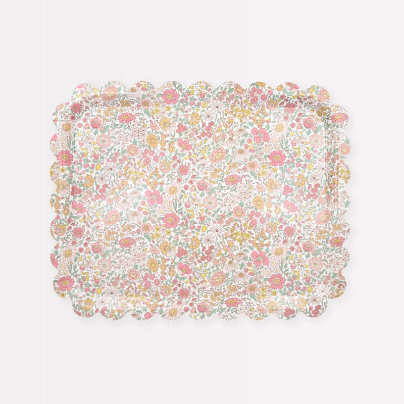 Part of our collaboration with Liberty, these statement rectangular trays combine practicality with style. A floral Liberty print design, with prominent pink tones, is teamed with a scalloped edge for a sophisticated look. This small tray is made from birch veneer plywood with a melamine coating for durability without compromising on elegance. Ideal for carrying and presenting food and drinks, for breakfast in bed, or as a base for decorative displays or storage.