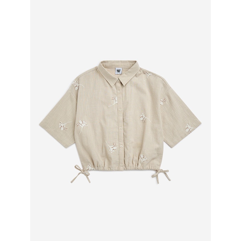 Y&F Kids presents this beige shirt, crafted from pure cotton and adorned with charming floral prints. Styled with an elasticated detailing at the waist for a snug yet comfortable fit, it features a structured spread collar, a button-up front, and short sle