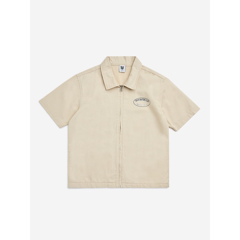 Y&F Kids presents this beige shirt, featuring bold text prints for a stylish touch. Crafted from pure-cotton, it carries a spread collar that extends to a zippered front with short sleeves, ensuring both comfort and a modern edge.