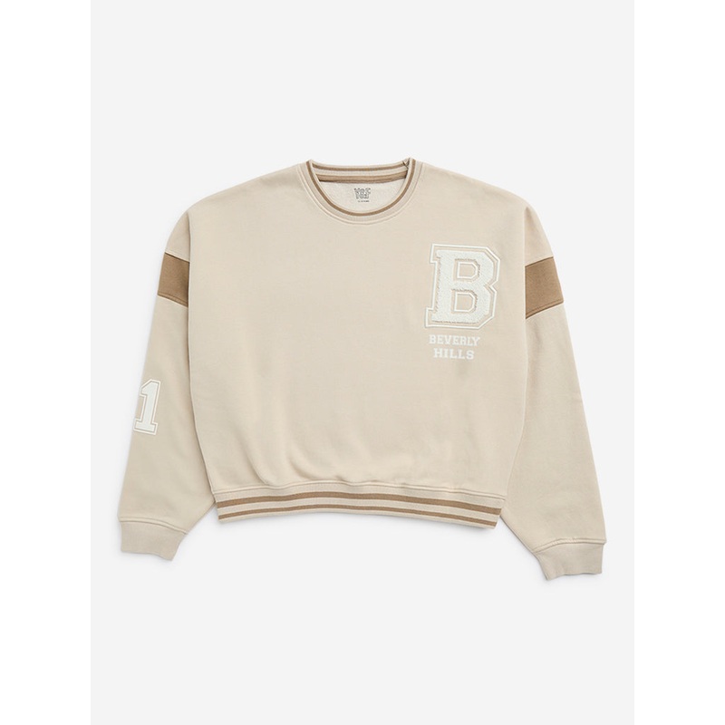 Y&F Kids introduces this beige sweatshirt highlighting stylish text designs. The winterwear is crafted in a cotton-rich blend and includes a round neck and dropped sleeves.