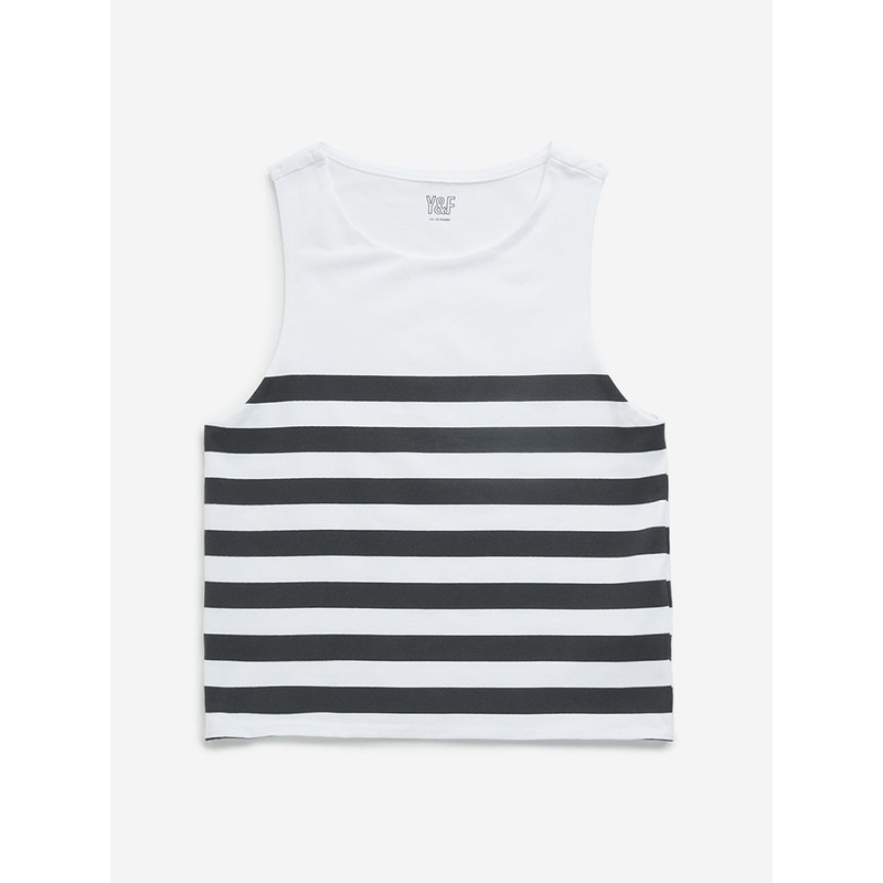 Y&F Kids introduces this black and white t-shirt adorned with striped patterns. It features a round neck and sleeveless design, crafted from a breathable fabric composition.