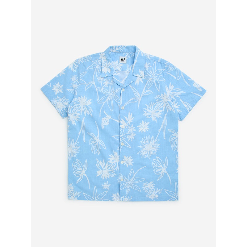 This blue floral printed shirt by Y&F Kids is crafted from soft and breathable fabric for lasting comfort. Designed with a classic camp collar, a button-down front, and short sleeves, its a stylish and versatile choice for casual wear.