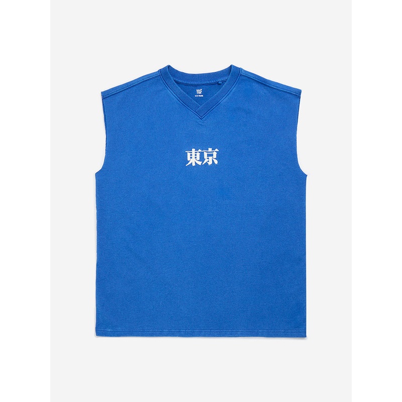 This blue t-shirt from Y&F Kids highlights Japanese-inspired text prints. Made from a cotton-rich fabric, it is complete with a V-neck and sleeveless cut.