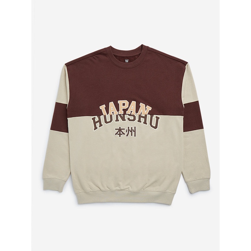 Featuring text designs, this brown sweatshirt from Y&F Kids flaunts a colour-blocked profile. Its pure-cotton build ensures everyday comfort, while the crew neck and full sleeves complete it.