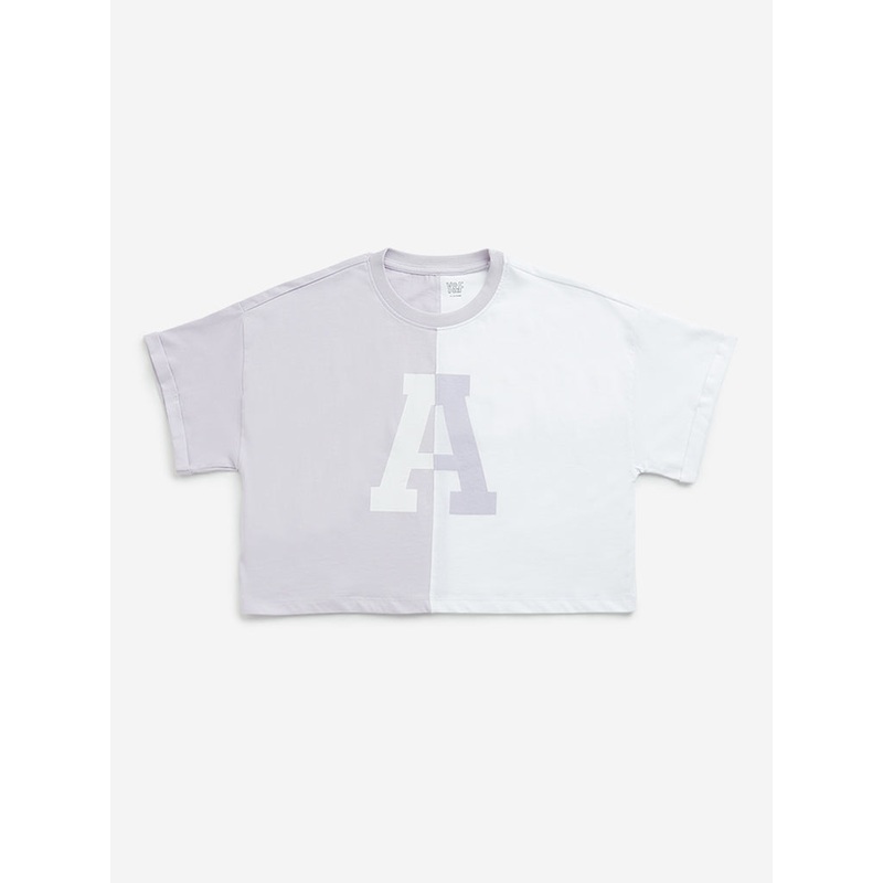 This lilac and white top from Y&F kids showcases text prints. Its cropped style, complete with a round neckline and short sleeves, adds a fashionable touch to this comforting piece crafted from pure cotton.