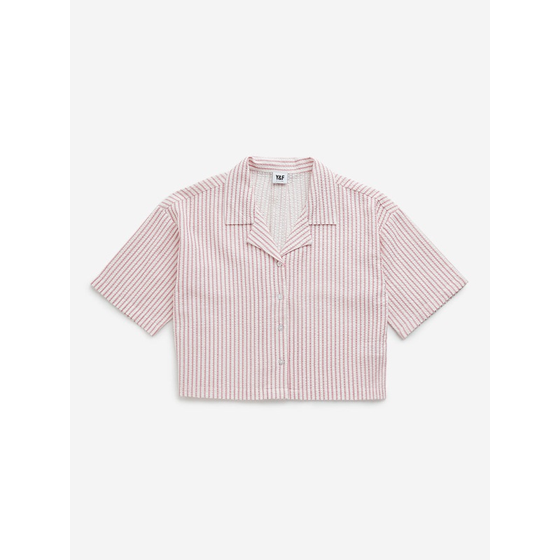 Crafted with striped patterns, this pink shirt from Y&F kids showcases a notched lapel, buttoned placket, and half sleeves. Made of seersucker fabric, it ensures optimal comfort and breathability.