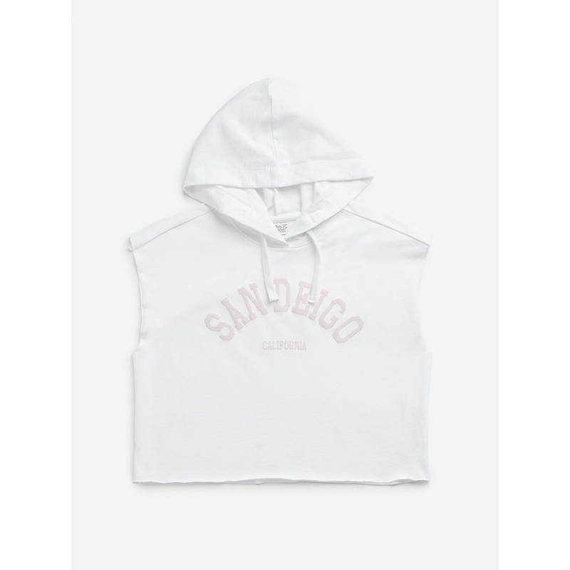 Featuring text prints and crafted from pure cotton, this white sleeveless t-shirt from Y&F Kids offers both style and comfort. Complete with a hood and adjustable drawstrings, it's a trendy addition to your wardrobe.