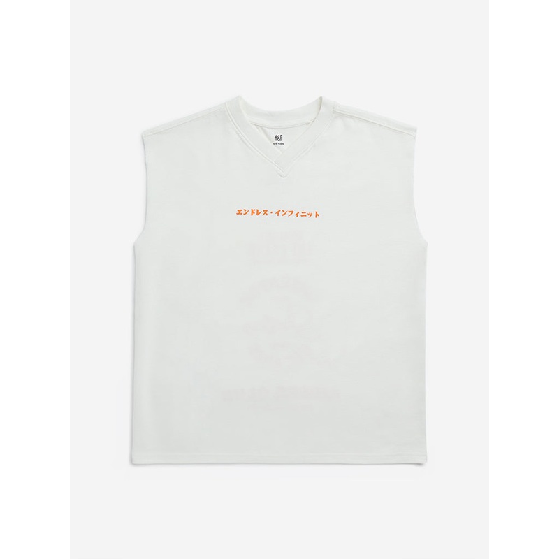 Y&F Kids presents this white t-shirt in text prints. Made with pure cotton, the regular fit garment includes a V-neck and a sleeveless cut.