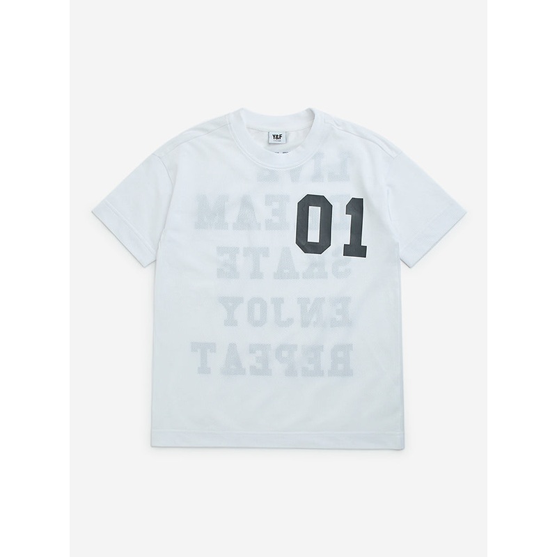 Y&F Kids launches this white perforated t-shirt in soft and breathable fabric for supreme breathability. The garment is adorned with text prints at the back for a stylish touch. It is completed with a crew neck and short sleeves.