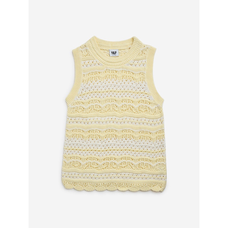 This yellow top from Y&F Kids is crafted from a cotton-blend fabric with a knit-textured finish. Designed with a ribbed round neck and a sleeveless silhouette, it offers a versatile and stylish touch, perfect for layering or wearing solo.